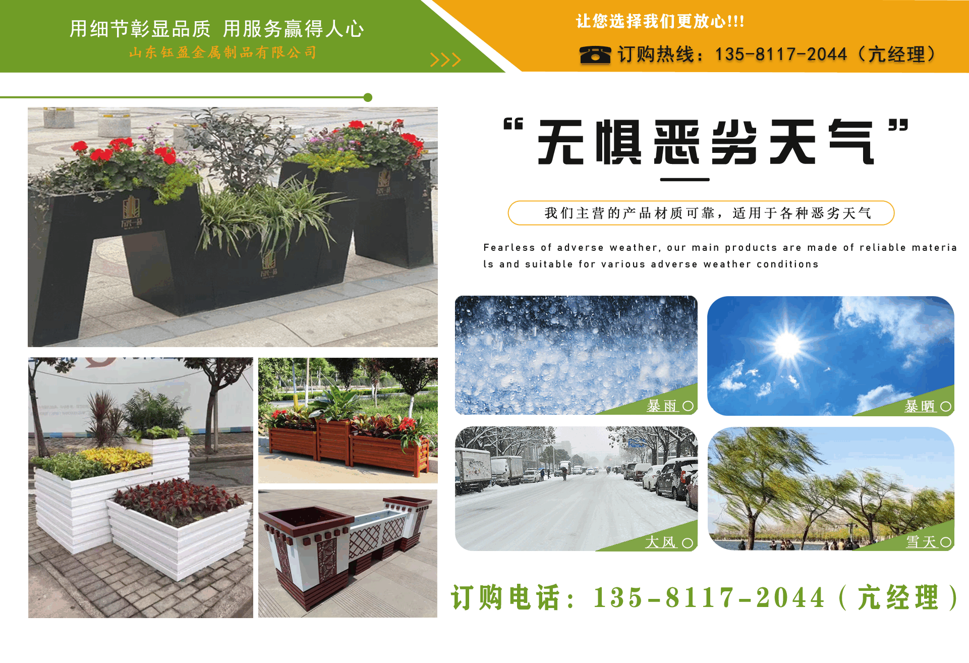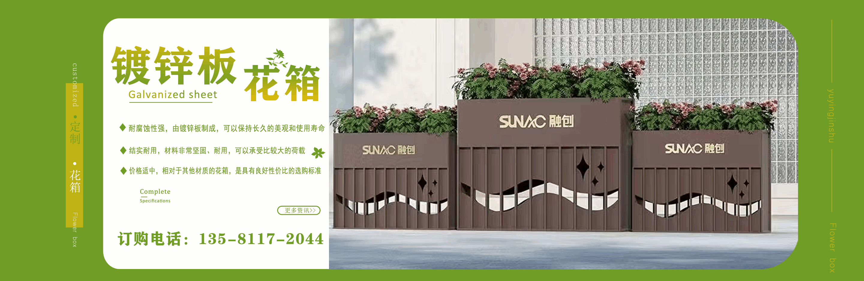 山東鈺盈金屬制品有限公司主營鍍鋅板花箱,道路隔斷花箱,定制花箱,戶外道路花箱,花箱座椅等產(chǎn)品,產(chǎn)品結(jié)構(gòu)合理、性能優(yōu)良,具有強(qiáng)度高、耐腐蝕、抗老化、隔熱隔音、節(jié)約能源、外形美觀、使用壽命長等優(yōu)點(diǎn),深受國內(nèi)外客戶認(rèn)可。  我們根據(jù)客戶所在城市的文化特征,制造出符合當(dāng)?shù)爻鞘形幕瘹庀⒌淖匀涣Ⅲw、觀賞性強(qiáng)的花箱產(chǎn)品成為城市里一道靚麗的風(fēng)景線。  公司實(shí)行誠實(shí)、公正、守信、價(jià)格合理、平等互利。  公司憑借雄厚經(jīng)驗(yàn)實(shí)力,恪守誠信為本的原則,得到了眾多客戶的信賴,并在業(yè)界獲得良好的口碑。建立了穩(wěn)固的合作關(guān)系,隨著業(yè)務(wù)的不斷發(fā)展和壯大,合作伙伴的范圍也在不斷擴(kuò)大。我們熱情盼望與您的合作,為社會的可持續(xù)發(fā)展獻(xiàn)上一份努力。...